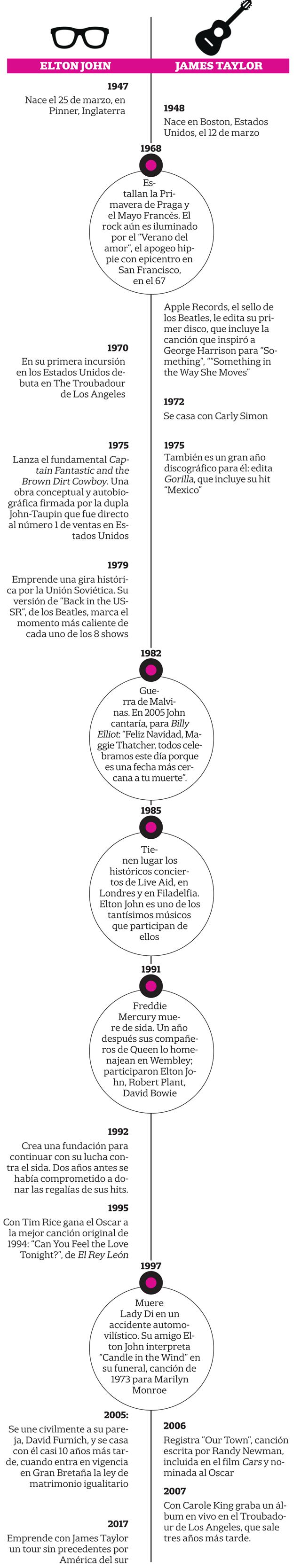 Hijos de la posguerra, Reginald Kenneth Dwight y James Vernon Taylor vinieron al mundo entre marzo del 47 y marzo del 48. El primero en Pinner, en las afueras de Londres; el segundo del otro lado del Atlántico, en Boston. Ambos empezaron sus carreras a fines de los 60, cuando los Beatles aún eran una banda activa y la psicodelia iluminaba al rock. Al norteamericano, la Primavera de Praga y el Mayo Francés lo sorprendieron con su primer disco solista en la calle, y al inglés registrando su episodio debut, Empty Sky. Hoy el hipódromo de Palermo será testigo de un encuentro singular. Ambos sacarán a relucir sus gemas más celebradas, en dos shows individuales en los que el acento estará puesto en los más de 50 años de trayectoria que cada uno carga sobre sus espaldas.