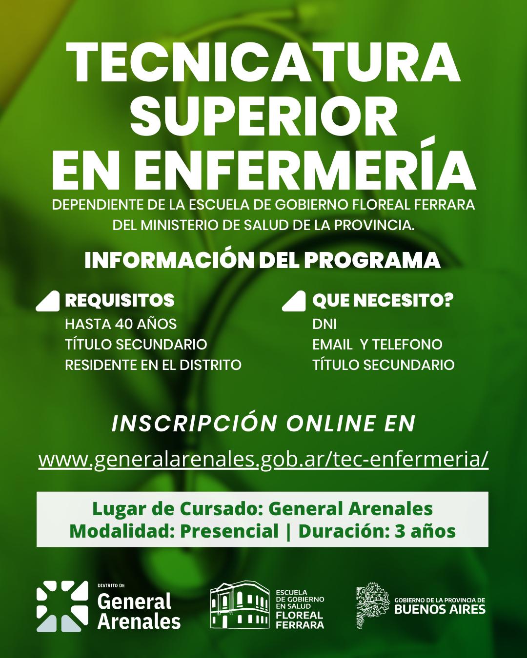 Las inscripciones se realizan exclusivamente de manera online a través del sitio oficial: www.generalarenales.gob.ar/tec-enfermeria/