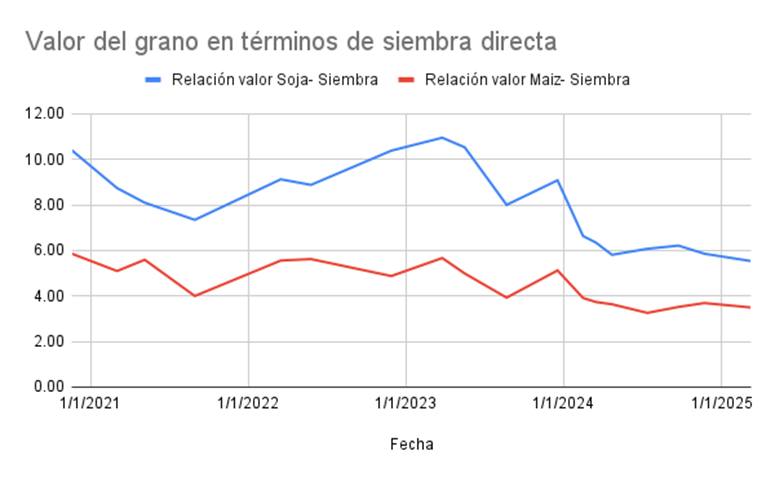 En cuanto a la siembra directa, los datos muestran una clara disminución en el poder adquisitivo del productor. En 2020, con el valor equivalente de una tonelada de soja, un productor podía pagar la siembra de 10 hectáreas. Esta cifra disminuyó gradualmente hasta 2023, cuando se recuperó levemente, rozando las 11 hectáreas. Sin embargo, para la última campaña, el valor de una tonelada de soja no alcanzó ni siquiera para sembrar 7 hectáreas. En el caso del maíz, la situación es similar: en 2020, el valor de una tonelada de maíz permitía sembrar casi 6 hectáreas, pero esta cifra fue disminuyendo hasta 2023, cuando casi se recuperó, y hoy no llega a 4 hectáreas.