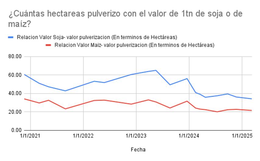 La pulverización sigue una tendencia similar a la siembra directa. El poder adquisitivo del productor para contratar este servicio ha disminuido con el tiempo, reflejando el aumento de los costos y la pérdida de capacidad adquisitiva. Al igual que con la siembra, los valores de los granos no han logrado compensar el incremento en los precios del servicio.