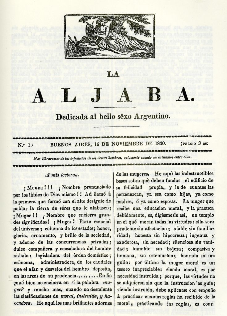 Durante 1830 se inicia el periódico femenino La Aljaba, escrito por mujeres, que pronto circulará por Buenos Aires. Su formato es modesto y las entregas constan de cuatro páginas. La publicación no dispone de domicilio propio, solamente se presenta la dirección de la Imprenta del Estado, lugar donde era impreso y editado. Lo que no se precisa es el tiraje de La Aljaba, seguramente la cantidad no debería ser elevada por su modalidad de distribución, que dependía solamente de suscripciones; sin incluir la venta en locales. No utiliza el recurso de incluir avisadores, que contribuyan con los gastos de edición, el costo de la publicación recae sobre la editora, esta situación le permite libertad y exclusividad en el contenido de la misma. En sus líneas postula el principio, para aquellos años, de igualdad de la condición social entre el hombre y la mujer, reflejando ser una pionera con respecto al mensaje promulgado.